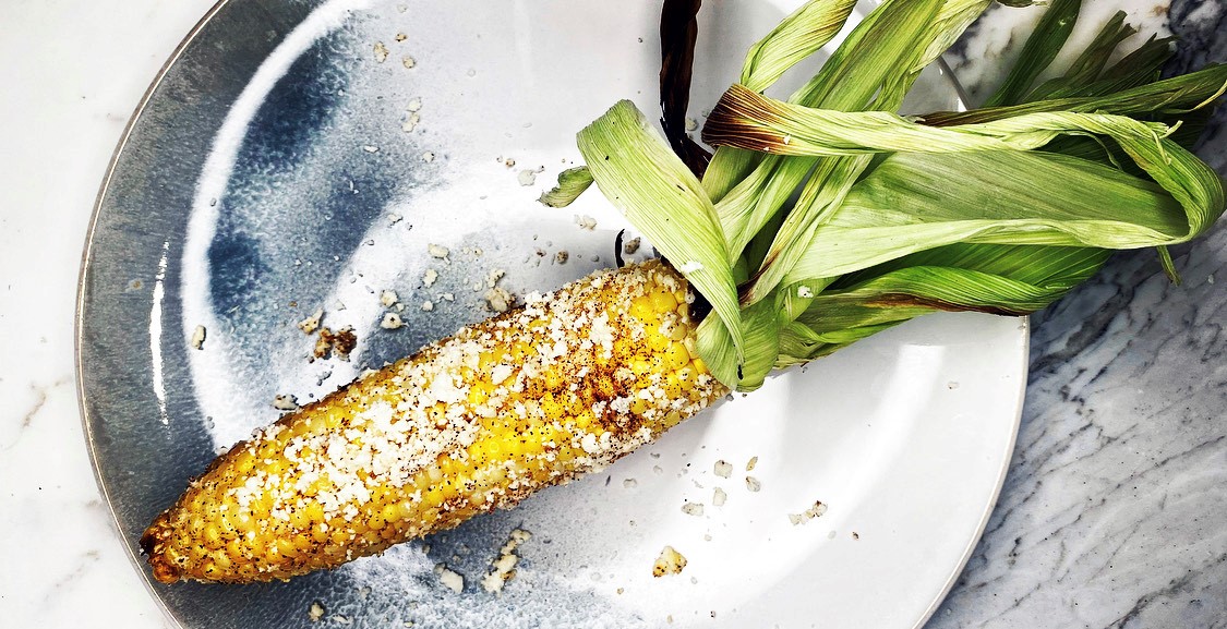 Preheat oven broiler and position rack about six inches from the heat source. Peel corn husk back but leave intact. Butter each ear of corn and place under broiler rotating so all sides are evenly charred. Remove from broiler and butter a second time. Roll in Cotija cheese and season with chili powder and sea salt.