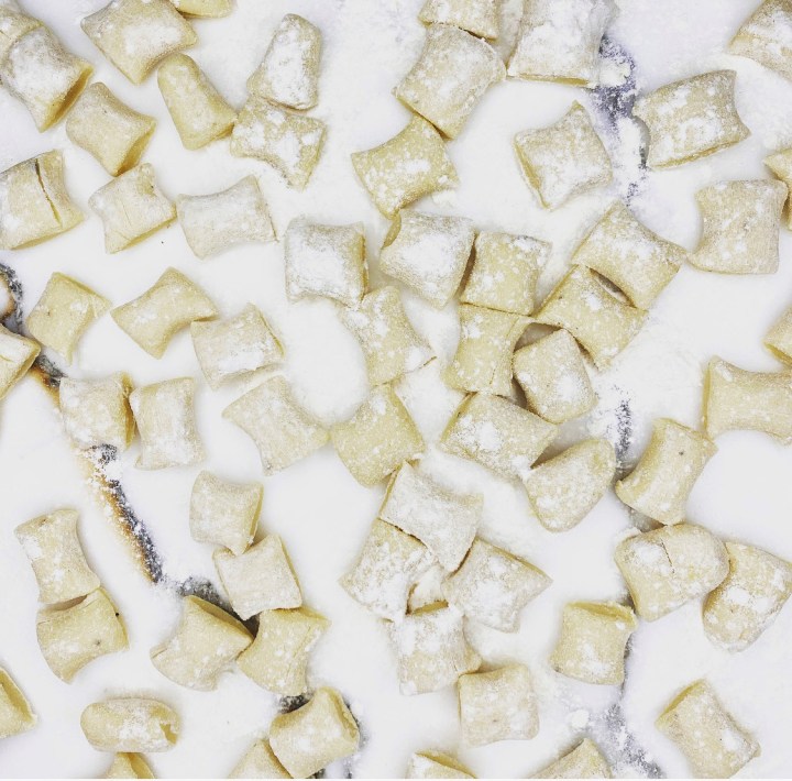 Divide dough into 4 pieces. Using your hands, roll each piece into a long rope, about ¾ inch diameter. Cut rope crosswise every ¾ of an inch. Arrange the gnocchi in a single layer and sprinkle them with flour.
