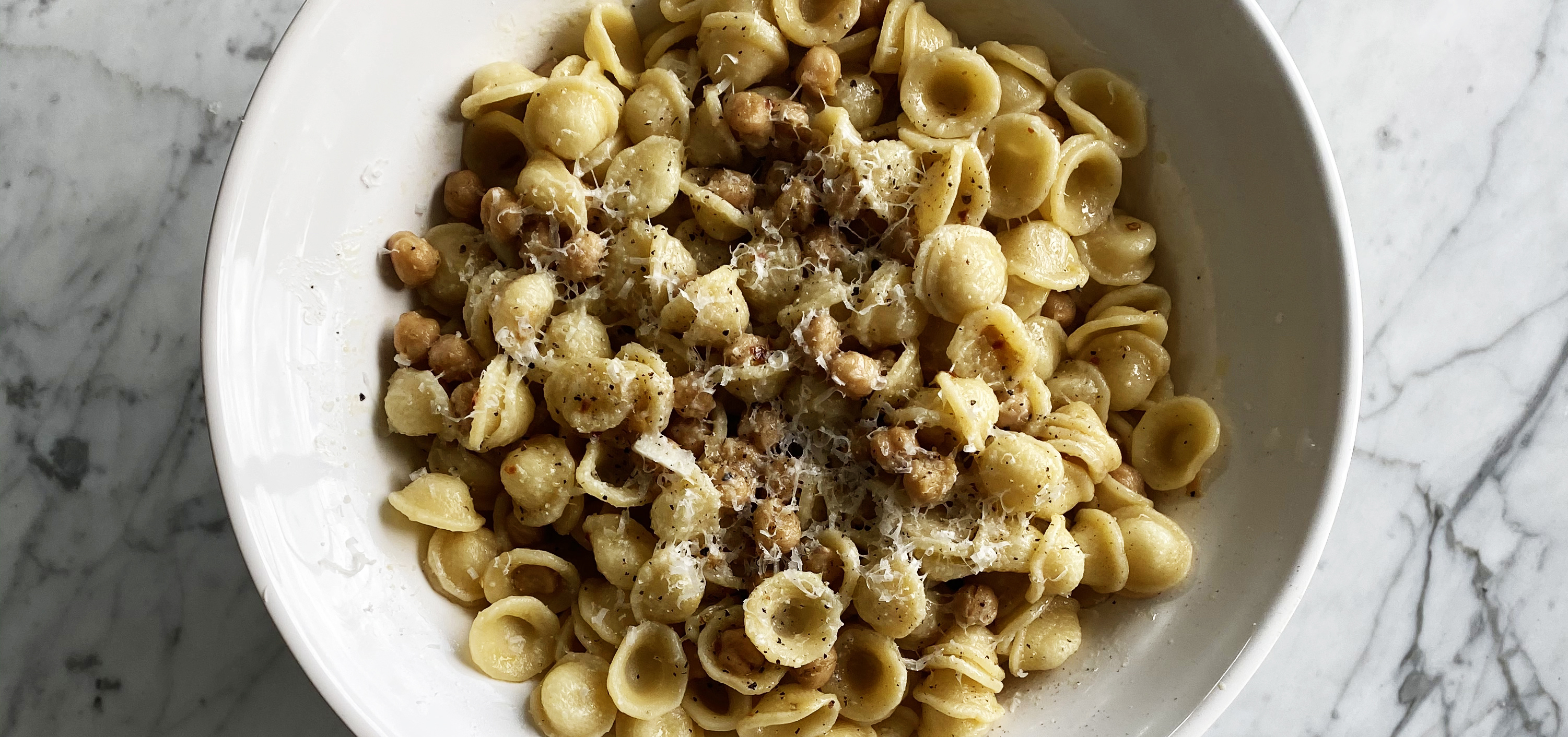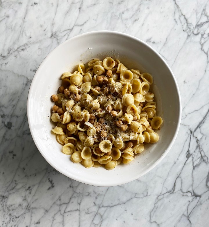 Toss pasta and chickpeas together and if needed add pasta water. Top with a generous amount of pecorino romano.