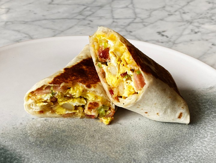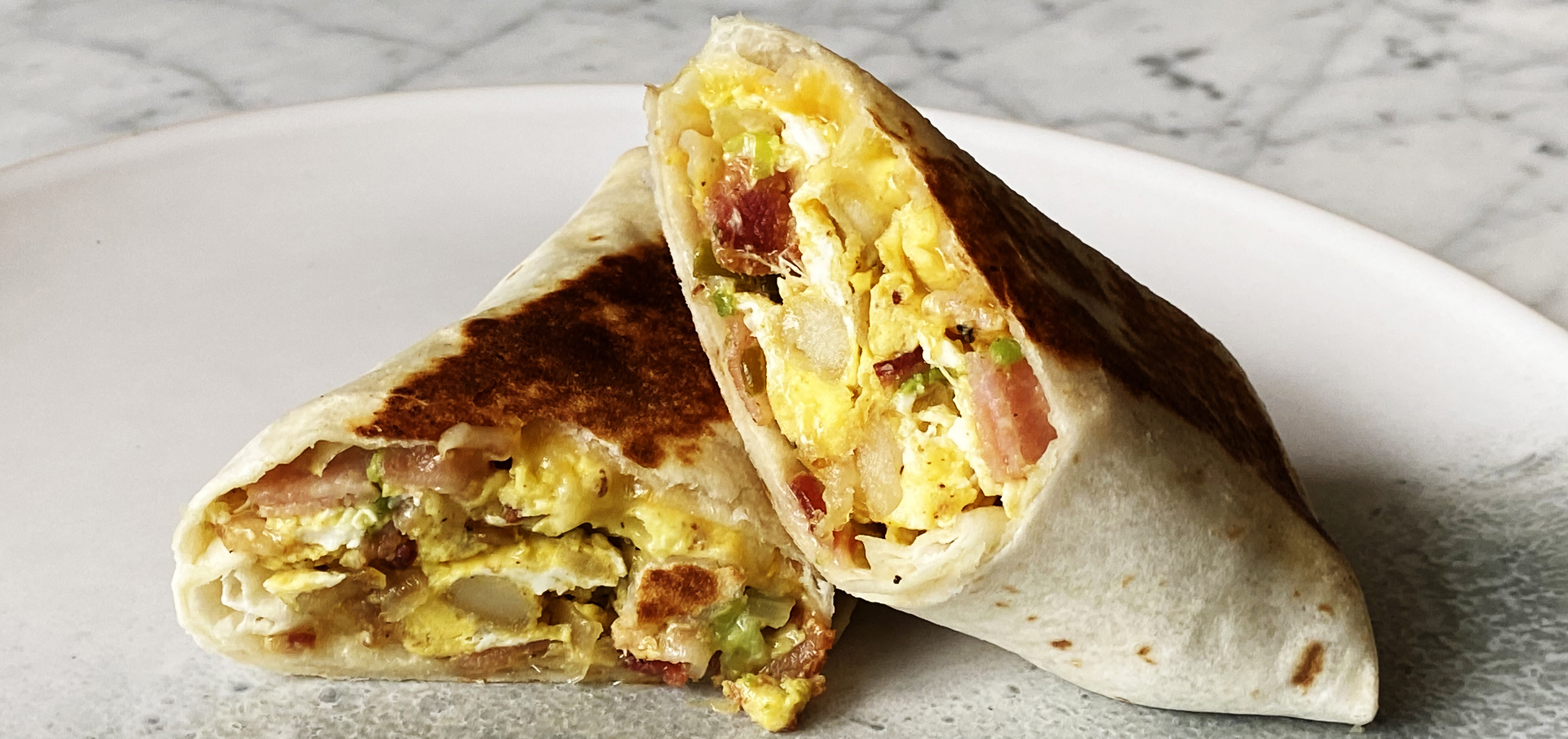 In a medium non-stick pan cook bacon over medium heat until crispy. Remove from pan and place on paper towel lined plate. Leave beacon fat in pan and add the chopped onions and jalapeno to the pan. Cook until softened, about 4 minutes. Add the bacon, green onions and eggs and season with salt and pepper. Scramble until just cooked through.Assemble the burritos: Evenly divide cheese between tortillas and then top with eggs and avocado. Fold in the side of the tortilla over the filling and roll, tucking in the edges as you go.