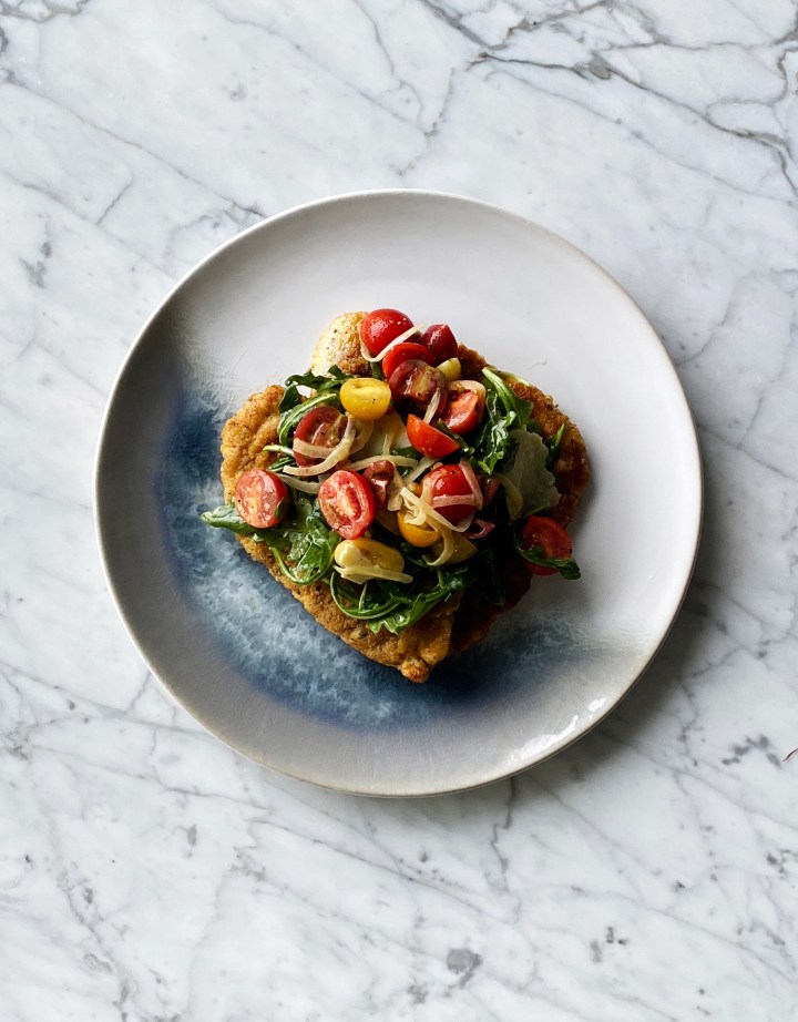 Crispy and tender pork cutlets topped with a beautiful and fresh arugula and cherry tomato salad. Simple yet refined, the perfect weeknight meal or an elegant dish to prepare for guest.
