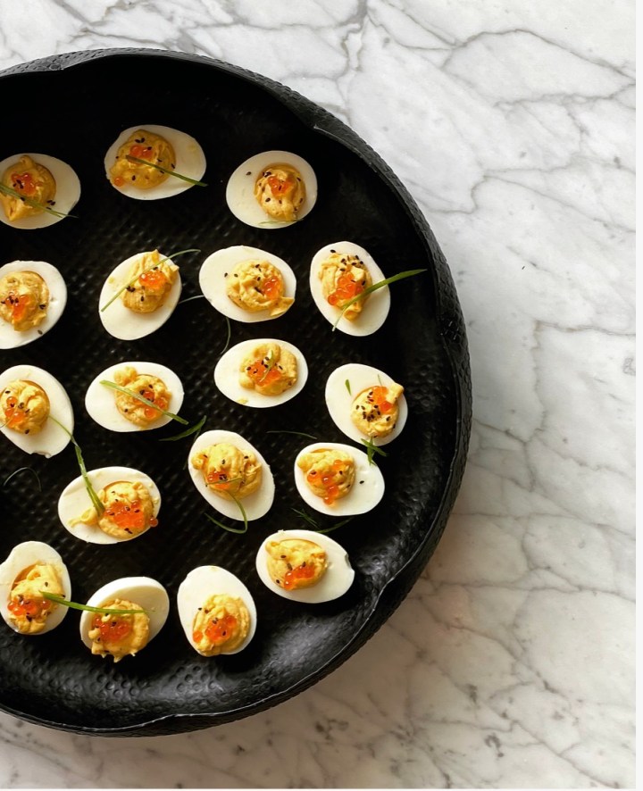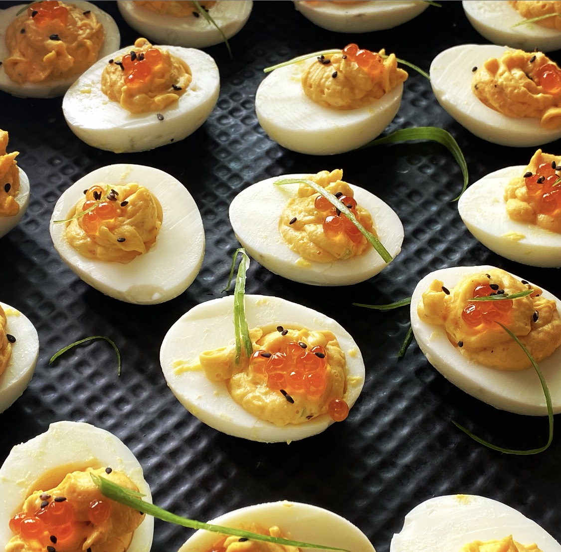 Using a pipping bag, fill the inside of the egg whites with the yolk mixture. Garnish with black sesame and salmon roe.