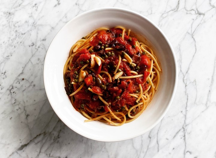 Using tongs, transfer spaghetti directly from the pot to the saucepan. Turn the heat back up to medium and toss the spaghetti with the puttanesca sauce. Top with freshly grated pecorino romano.