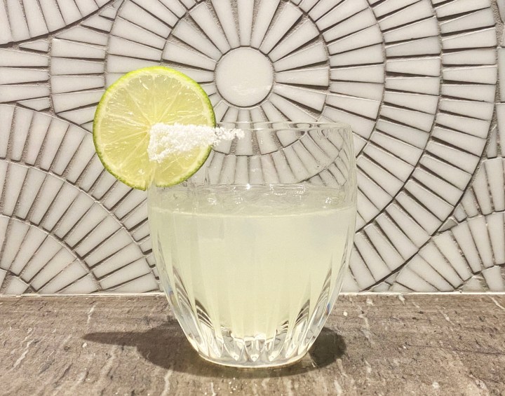 Prepare the cocktail glass by running a lime around a quarter of the top rim of a glass. Dip the rim in the salt and add ice to glass.