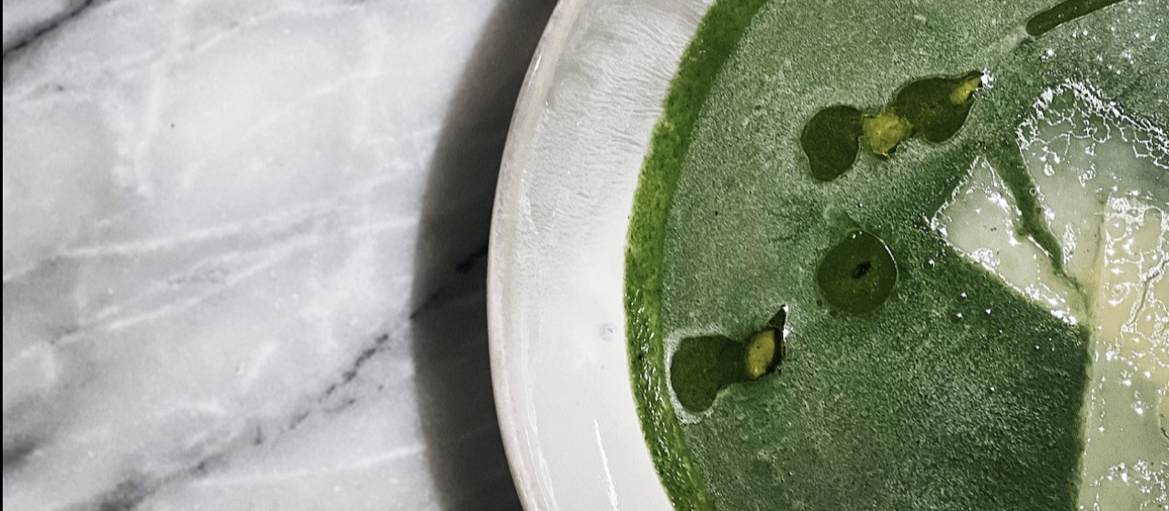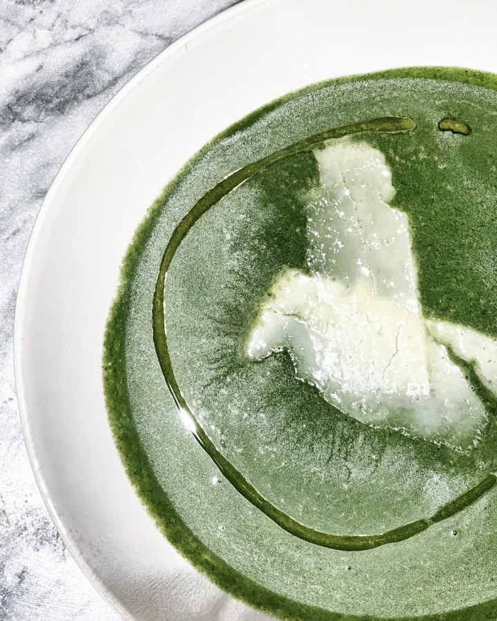 Transfer the spinach to the soup pot. Add the water and salt and pepper. Bring to a boil and cook for 5 minutes. Remove rosemary spring, add cream. Using an immersion blender puree soup until smooth and finely blended.