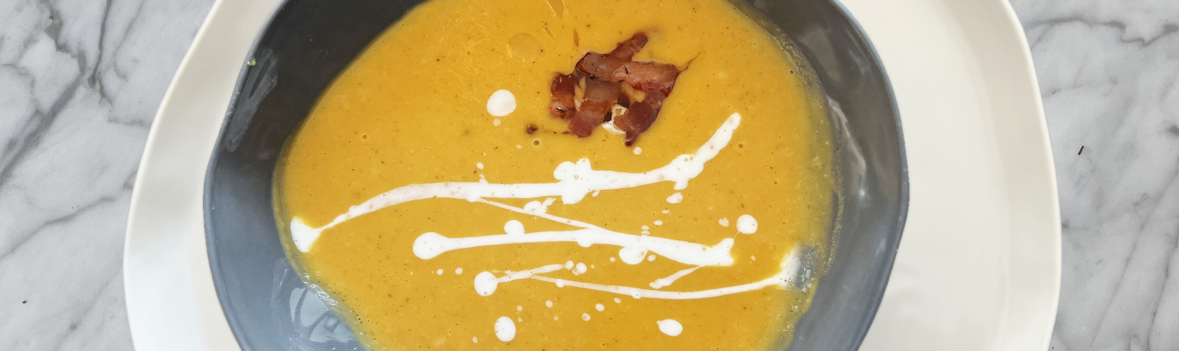 Preheat the oven to 400°F. In a large, oven-proof Dutch oven, toss together the butternut squash, shallot, olive oil, maple syrup, sage, cayenne, cinnamon, and salt and pepper. Roast until the squash is tender, about 45 minutes. Transfer the roasted squash and all the liquid to a blender and puree until smooth. Return the puree to the Dutch oven and stir in the coconut cream and butter. Simmer the soup until warmed through. Meanwhile, in a small pan, cook the pancetta until crispy. Remove from the pan and drain any excess oil. Divide the soup into bowls and garnish with pancetta.
